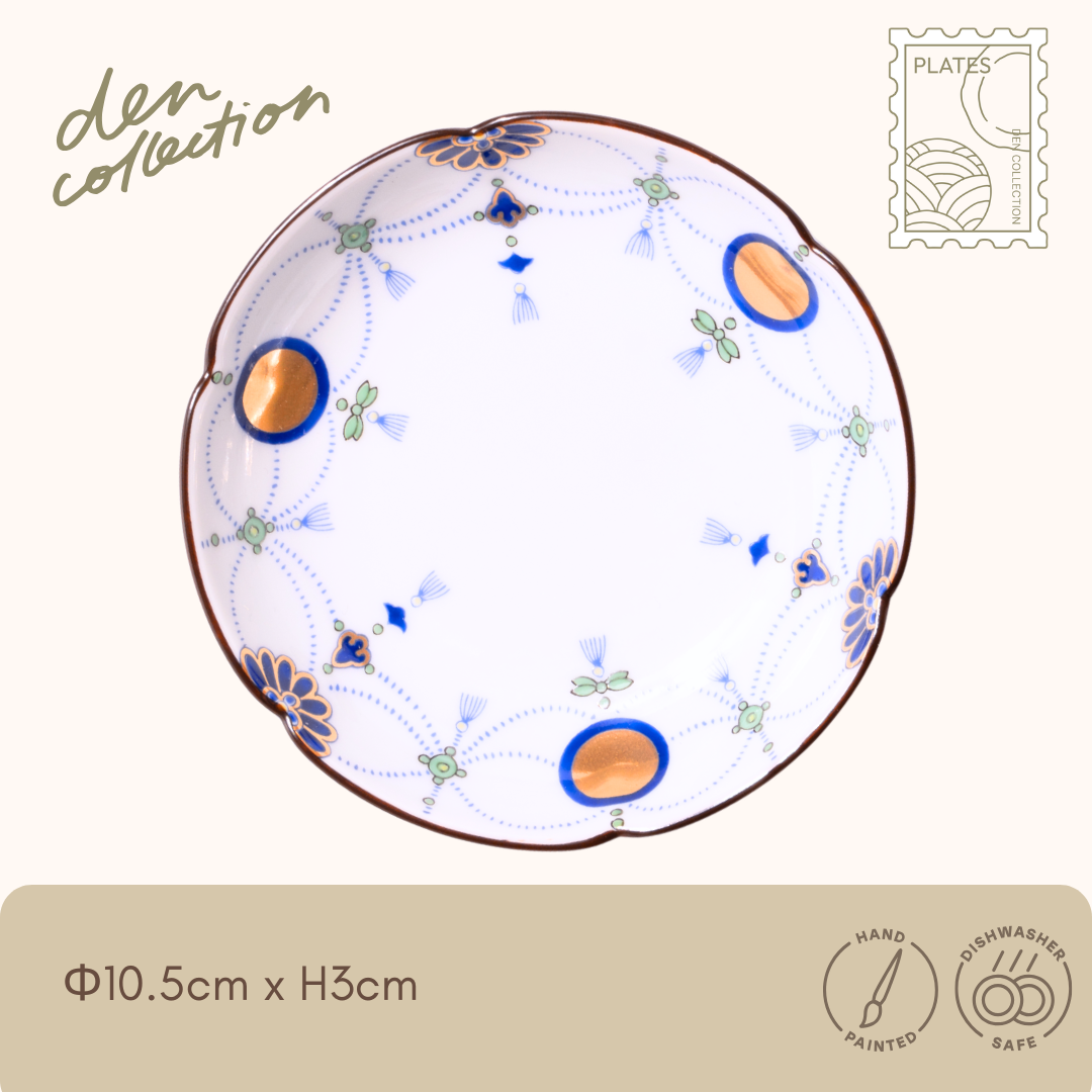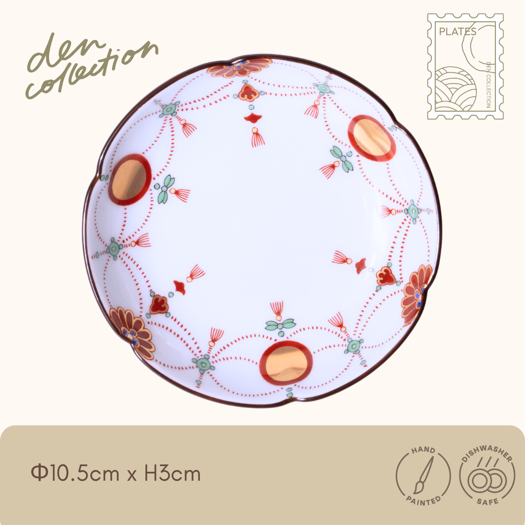 繊細な装飾が連なる「瓔珞文」をあしらった、有田焼の上品な小皿。